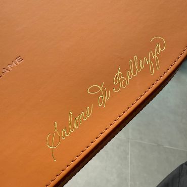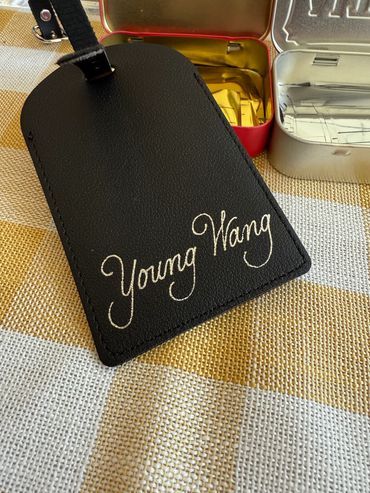 Heat foiling is a method that lays down colored foil onto the surface. This can be used on real leather, vegan leather and other select soft surfaces. The effect is permanent, and can be the best option when paint pens won't work. Items such as luggage tags, desk blotters and handbags are all perfectly suited to personalize using shimmering foil.